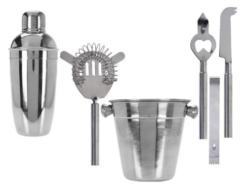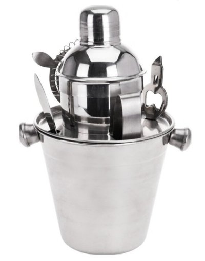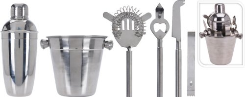- materiál: nerezová oceľ - sada obsahuje 7 ks: - vedro na ľad - veko na vedro / zakladač pre uloženie vo vedre - shaker s uzáverom - sitko - otvárač - nôž - kliešte na ľad alebo ovocie