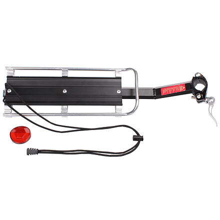 Hliníkový nosič na sedlovku Merco Shelf na prevoz najrôznejšieho nákladu a batožiny je určený predovšetkým pre bicykle, pri ktorých nie je možné pod sedlo pripevniť štandardný nosič. Napríklad keď chcete nosičom vybaviť celoodpružený bicykel. Konštrukcia nosiča je tvorená robustným oceľovým nosníkom, na ktorom je prinitovaný ľahký hliníkový profil s nákladovou plochou 30 x 12 cm. Privarená delená objímka s rýchloupinákom potom umožňuje ľahké nasadenie nosiča bez nutnosti vybratia sedlovky z rámu. Shelf nosič je možné bez použitia ďalších nástrojov pripevniť ku všetkým sedlovkám s priemerom 28 – 38 mm. Súčasťou nosiča je gumolano a bezpečnostná odrazka, ktorú jednoduchým nasunutím pripevníte do príslušného držiaka na zadnej strane nosiča. Nosič Merco Shelf nie je určený na prepravu osôb. Jeho maximálna nosnosť je 9 kg a celková hmotnosť celokovového nosiča je potom približne 600 gramov.