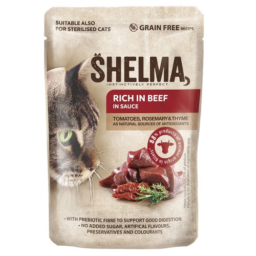 Superprémiové kompletné krmivo pre mačky s hovädzím, paradajkami a bylinkami v omáčke.