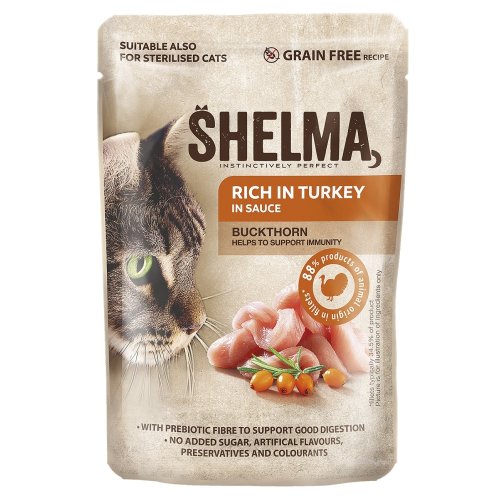 Superprémiové kompletné krmivo pre mačky s morkou a rakytníkom v omáčke.