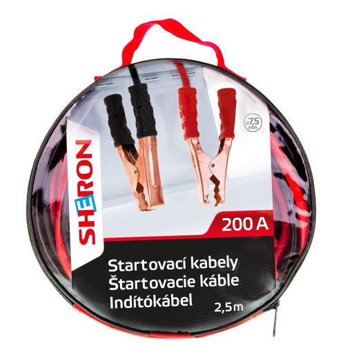 SHERON Štartovacie káble 200A sú kvalitné káble balené v praktickom, znovuuzatvárateľnom obale s uškom. Štartovacie káble s označením 200 A sú určené na núdzové štartovanie batérií s maximálnym prúdovým zaťažením 200 ampér. Ide napr. o malé akumulátory používané v motocykloch, štvorkolkách či pri záhradnej technike. Údaj o prúdovom zaťažení batérie je uvedený priamo na batérii. Dĺžka káblov: 2,5 m.