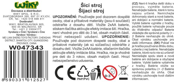 Šijací stroj s efektmi. Veľkosť 14 cm. Vydáva svetelné a zvukové efekty. Presné rozmery 15x7x14 cm. Batérie 2xAA nie sú súčasťou balenia.