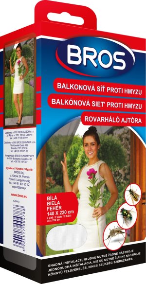 Balkónová sieť proti hmyzu na ochranu interiéru pred náročným hmyzom. Na inštaláciu nie sú potrebné žiadne nástroje, sieť sa upevní na pásku, ktorá sa prilepí k rámu dverí. Zašpinenú sieť je možné vyprať. Skladá sa z dvoch častí s rozmermi 75x220 cm, takže celkom zakryje plochu 140x220 cm. UV stabilný. Materiál: 100% polyester. Farba: biela.