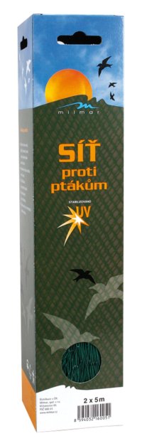 Sieťovina na ochranu bobuľovín, kôstkovín, jahôd, vínnej révy a iných plodín pred napadnutím vtáctvom. Vyrobená z polyetylénovej sieťky. Po zbere je možné sieť sňať a znovu použiť Farba: zelená. Rozmery: 2 x 5 m.