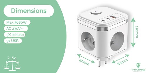 Technické špecifikácie: Model: Viking Y33 AC 230V vstup: 230V, 16A, 50Hz, 3680W max. AC 230V výstup (3x): 230V, 16A, 50Hz, 3680W max. DC USB-A výstup (1x): 5V /2A, 12V/1,5A DC USB-C výstup (2x): 5V/3A, 9V/2,22A, 12V/1,67A DC USB-A + USB-C + USB-C výstup: 5V/3, 4A , 17W Hmotnosť: 215 g Rozmery: 11 x 8 x 8 cm