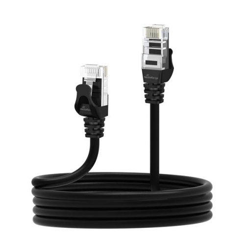 • Čierny 5 m dlhý sieťový kábel MediaRange, UTP CAT 6 (1Gbps), konektor RJ45 so zacvakávacími zámkami, zaisťujúce optimálne dátové prenosy s maximálnou rýchlosťou až 1 Gbps