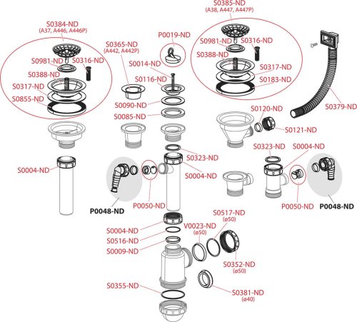 Pre drez. Vývod odpadu pripravený na napojenie odpadovej rúrky pr. 50 alebo pr. 40 mm. Materiál: polypropylén Zápachová uzávera: 53 mm Prietok: 44 l / min Tepelný atest: 95 °C