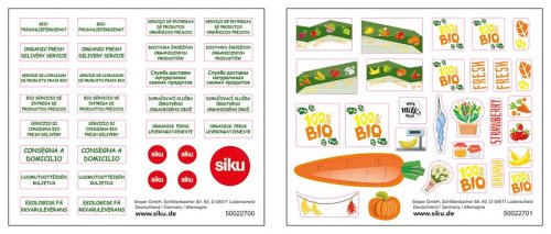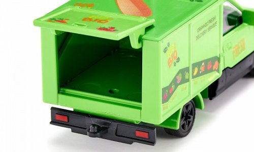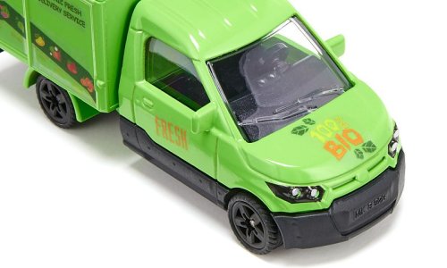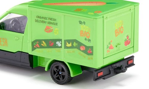 Čerstvá vajcia a mlieko, chrumkavý rustikálny chlieb, šťavnaté ovocie a chrumkavá zelenina priamo z polí – BIO donášková služba dovezie jedlo priamo k vašim domovým dverám v meste. Ekologický je nielen tovar, ale aj doprava, pretože elektrická dodávka StreetScooterom je úplne bez emisií. Kabína vodiča tohto modelu siku je vyrobená z kovu a nadstavba je plastová. Na nakladanie a vykladanie je možné otvoriť veko v zadnej časti. S priloženým archom samolepiek môže byť prepravník navyše ozdobený nápisom „Čerstvé bio dodávky“ v rôznych jazykoch a tiež farebnými obrázkami ovocia a zeleniny. A pretože zásielková služba vyžaduje vhodné produkty, sú k dispozícii aj štyri kartónové archy, z ktorých je možné vylisovať predtlačené potraviny, ako je ovocie, zelenina, vajcia a mlieko. Iba na dvoch zo štyroch listov sú však komponenty vytlačené plnofarebne. Na zvyšné dva listy sú vytlačené iba obrysy, a tak sú deti samy kreatívne a môžu si potraviny farbiť, ako chcú. Rozmery balenia: 17,5 x 9,7 x 7,1 cm. Vek: 3+