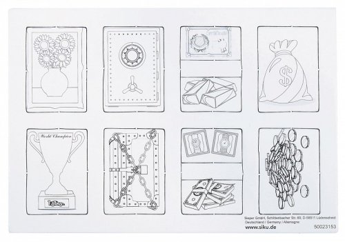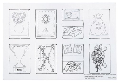 Pancierovaný oceľový priestor pre posádku, výkonný podvozok 4x4 LKW a najnovšia ochranná technológia – prepravník peňazí Rheinmetall Survivor je špeciálne vozidlo vo svojej triede. Veď je určený pre dôležité špeciálne nasadenia a na prepravu zvlášť cenných alebo citlivých nákladov. Či už ide o bankovky, šperky, dôležité umelecké diela alebo kontroverzné dokumenty – v pancierovanej oceľovej priehradke pre posádku je exkluzívny náklad 100 percent chránený. Prepravník peňazí od siku je v nenápadnej metalickej modrej farbe a na bokoch je aplikované logo „Global Security“. Dvere na oboch stranách a vzadu je možné otvoriť. Pomocou priložených hárkov samolepiek je možné vozidlo ešte ďalej nakonfigurovať, napríklad „Preprava peňazí a cenností“ a „Monitorované GPS“ v rôznych jazykoch. Pre obzvlášť realistickú zábavu pri hraní obsahuje sada aj štyri malé zlaté tehličky a štyri kartónové listy s ďalšími hernými komponentmi. Tie zobrazujú rôzne náklady, ako sú vrecia s peniazmi, pokladničky, obrazy a certifikáty. Predtlačené komponenty je možné jednoducho vylisovať z kartónových hárkov a uložiť do transportéra. Zvláštne zvýraznenie: Dva z kartónových listov sú predtlačené a ďalšie dva obsahujú iba obrysy, takže jednotlivé komponenty môže užívateľ vyfarbiť a kreatívne navrhnúť. Rozmery balenia: 17,5 x 9,7 x 7,1 cm. Vek: 3+