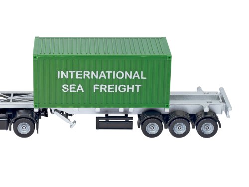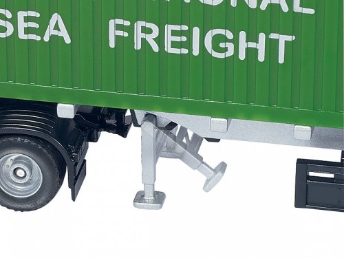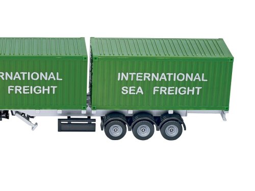 Nákladiak s kontajnerom je detailne prepracovaná kópia v mierke 1:50. Výrobky všetkého druhu sú prepravované po celom svete pomocou prepravných kontajnerov. Po ceste sú tieto kontajnery prepravované pomocou nákladných áut s návesmi. Pre váš SIKU WORLD je dokonalou novinkou tento Mercedes - Actros, v kombinácii s 2 kontajnermi. Dĺžka návesu je variabilná a môže byť modifikovaná podľa toho, či preváža jeden alebo dva kontajnery. Pokiaľ bude prepravovať iba jeden kontajner, je možné zadnú časť návesu zasunúť tak, že bude náklad umiestnený v strede návesu, pre optimálne rozloženie hmotnosti. Kontajnery sú vybavené pohyblivými dverami, vďaka sa pohodlne nakladajú a vykladajú. Rozmer: 317 x 59 x 8 mm. Rozmer balenia: 36 x 7,2 x 11,5 cm. Vek: 3+