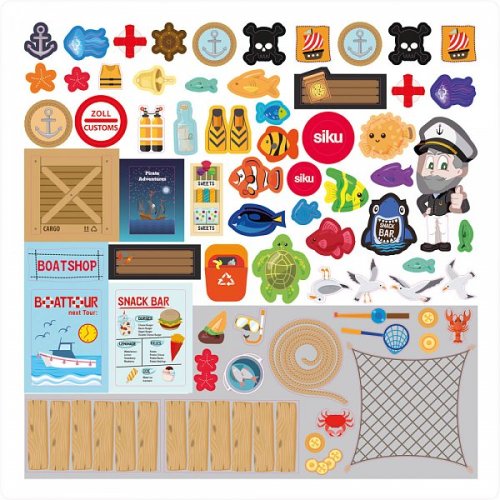 SIKU World – nakladací prístav, mólo. Z jednotlivých dielov je možné plochu prístavu zostaviť niekoľkými rôznymi spôsobmi. Akonáhle máte hotovo, ozdobte si prístav pomocou priložených samolepiek (65ks) podľa svojej fantázie. Loď je možné spustiť do vody alebo vytiahnuť von pomocou nájazdovej rampy. V stánku s rýchlym občerstvením si pracovníci prístavu dávajú na obed ryby a hranolky. Po skončení obedňajšej prestávky pomáhajú pracovníci prístavu ukotviť loď k mólu. Na bezpečné ukotvenie lode k väzáku na móle je potrebných niekoľko zručných akcií. Pohyblivé rameno žeriava s pojazdovým vozíkom a špeciálnym chápadlom pomáha vyložiť náklad z lode. Náklad musí byť vyložený rýchlo, pretože kapitán chce čoskoro vyplávať. Nakladací prístav SIKUWORLD sa skladá z nákladnej lode, bójí, dvoch vlajok, stánku s občerstvením, móla, rampy, dvoch základných plastových dosiek v modrom prevedení, žeriava a prepravného boxu. Prepravný box je možné otvoriť, plniť a vyprázdňovať. Nakladací prístav SIKUWORLD je dokonalým doplnkom vodného sveta SIKUWORLD a kontajnerovej lode SIKUWORLD. Rozmer hracej plochy cca: 90 x 36 cm. Súprava obsahuje viac ako 100 dielikov. Rozmer balenia: 41 x 27,6 x 7,3 cm. Vek: 3+. Video: https://www.youtube.com/watch?v=jgcFl_Hm36U