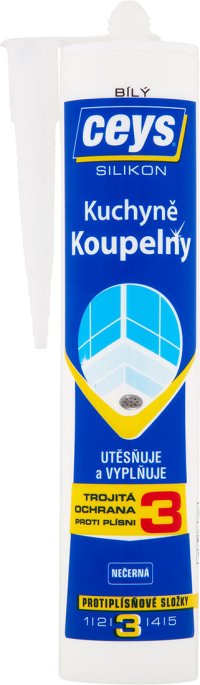 Silikón CEYS je acetátový silikón, ideálny na tmelenie spojov v kuchyniach a kúpeľniach. Zabraňuje presakovaniu vody a vlhkosti. Použitie - sanitárne zariadenia, kuchynské linky, drezy, vane, umývadlá, sprchové kúty, WC, obklady, pracovné dosky, atď. spája so všetkými konštrukčnými materiálmi. Vďaka obsiahnutému fungicídu zaisťujúce odolnosť proti plesni, netmavne. Odoláva vlhkosti, pracím práškom a mydlám. Nezmrští sa, neodlepí ani nepraskne.