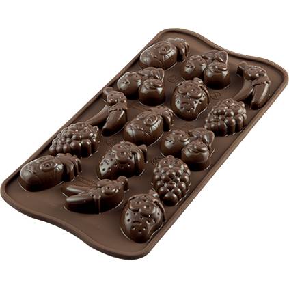 Nepriľnavá forma zo silikónu na prípravu pätnástich cukríkov v tvare veselého ovocia s očami.