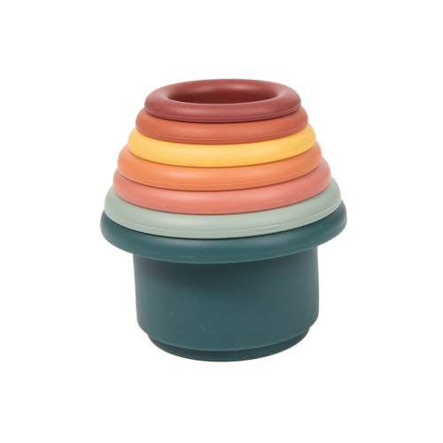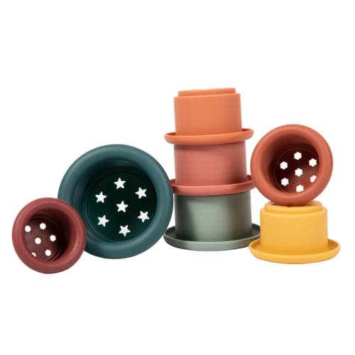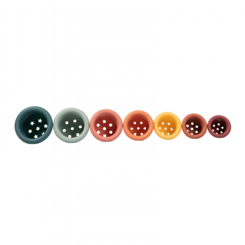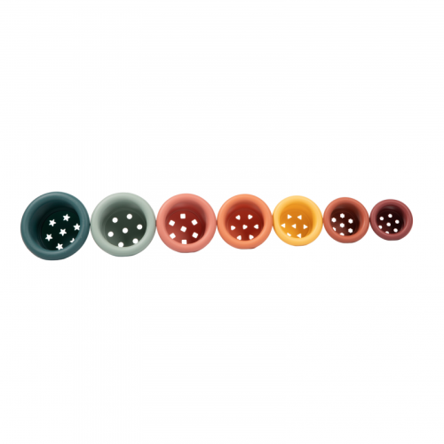 Silikónové stohovacie kalíšky rôznych veľkostí a farieb.