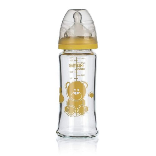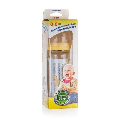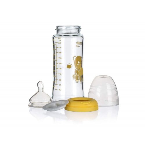 Fľaša dojčenská širokohrdlá 0,25 l, sa vyrába z tvrdého boritokremičitého skla, ktoré je veľmi odolné (mechanicky aj teplotne +300/-40 stupňov). Výhodou je dlhá životnosť, hygienická nezávadnosť a ľahká údržba (možno umývať v umývačke riadu).