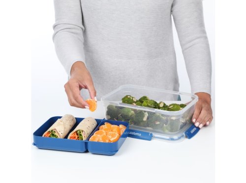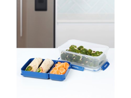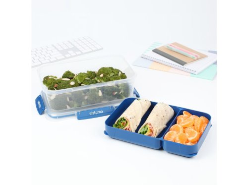 Sistema 2,2 l TO GO STAX je skvelou voľbou pre všetkých, ktorí hľadajú praktický a štýlový spôsob, ako bezpečne prenášať jedlo do práce, školy aj na cesty. Odnímateľný zásobník umožňuje oddelenie rôznych druhov potravín, takže si môžete vychutnať čerstvú a chutnú desiatu kedykoľvek a kdekoľvek. Stohovateľný tvar zaisťuje maximálne využitie priestoru v špajze, chladničke a mrazničke. Ľahko uzatvárateľné klipy Sistema® a pružné tesnenie udržujú potraviny dlhšie čerstvé. Vhodné na umývanie v umývačke riadu v hornom koši.
