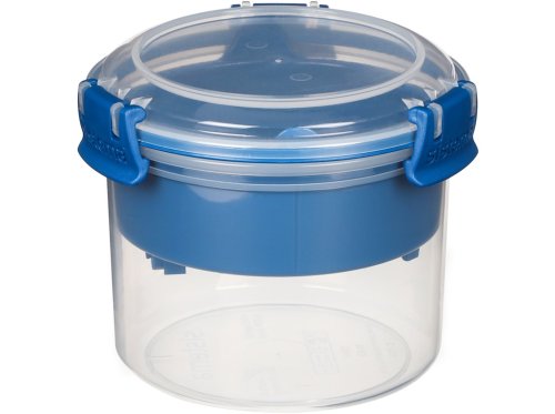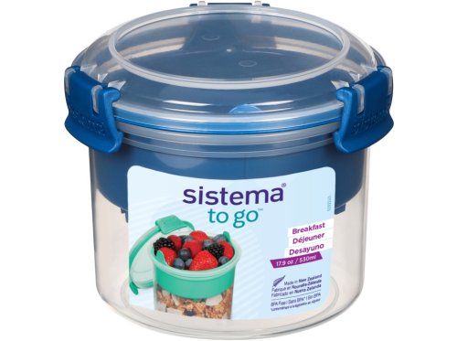 Sistema TO GO 530 ml s vnútornou oddelenou miskou a lyžičkou je šikovný a praktický pomocník pre všetkých, ktorí si chcú vziať zdravé raňajky alebo desiatu do práce, do školy alebo na výlety. Praktický tvar umožňuje ukladať oddelene rôzne druhy potravín a premiešať ich tesne pred konzumáciou. V spodnej časti môžete uložiť napríklad jogurt, v hornú akúkoľvek vhodnú prísadu (müsli, ovocie, sušené plody alebo cereálie). Vďaka priloženej lyžičke môžete svoje obľúbené pochúťky konzumovať kdekoľvek. Stohovateľný tvar zaisťuje maximálne využitie priestoru v špajze, chladničke a mrazničke. Vhodné na umývanie v umývačke riadu v hornom koši.