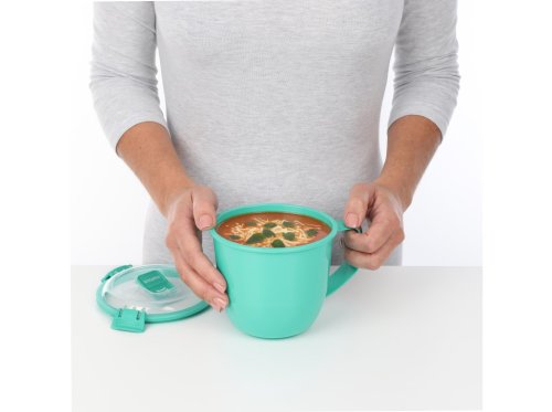 Vďaka špeciálnemu ventilu môžete ohrievať aj nádoby s nasadeným viečkom. Predídete tak ušpineniu a pracnému čisteniu mikrovlnnej rúry. Ouško nádoby je navrhnuté tak, aby poskytovalo pohodlný úchop a umožňovalo ľahké prenesenie bez popálenia z mikrovlnnej rúry až na stôl. Tento produkt nie je vodotesný.
