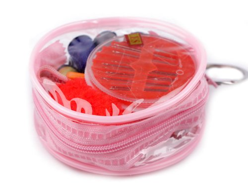 Veľmi praktické šitíčko v priehľadnej taštičke s priemerom 7,5 cm so zipsovým zapínaním. Obsahuje [8 cievečiek nití rôznych farieb, sadu ručných ihiel, ihelníček, meter], náprstok a nožnice.