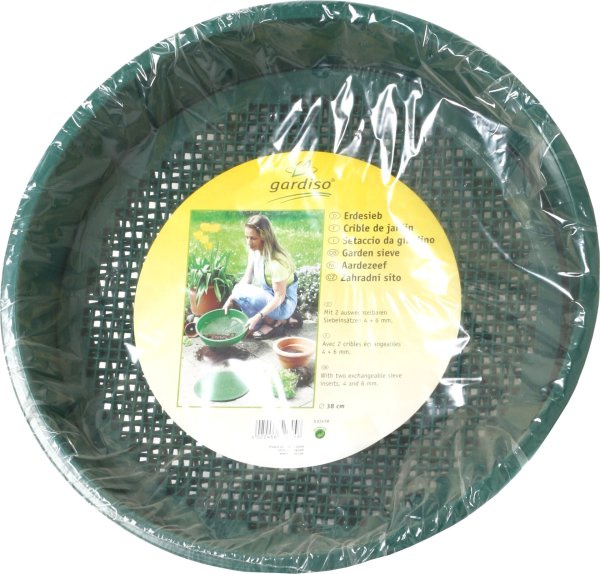 Záhradný sito na preosievanie pôdy s dvoma vymeniteľnými vložkami (4 a 6 mm). Farba: tmavo zelená. Šírka: 38 cm.