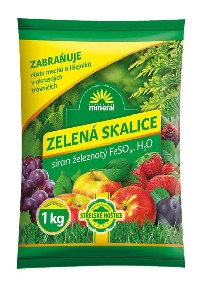 Skalica ZELENÁ 1 kg. hmotnosť: 1 kg zloženie: Fe 29%, S 31,5% Skalica zelená - síran železnatý - odstraňuje príčiny akútneho nedostatku železa v rastlinách /chloróza/.