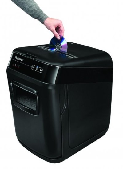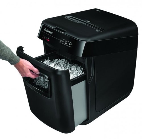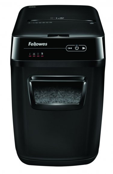 Skartovač AutoMax 200C DIN 3 značky Fellowes s krížovým rezom 4 x 38 mm poskytuje skartovaciu kapacitu až 200 listov / 70 g papiera, objem koša až 32 litrov a šírku vstupu 345 mm .