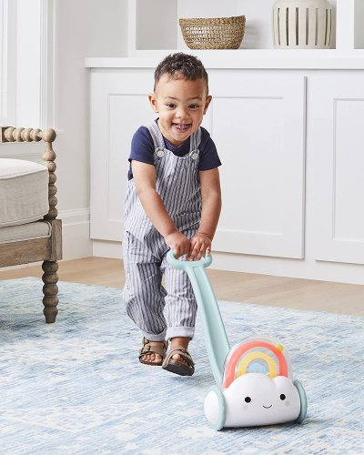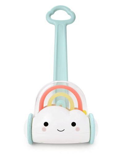 Klasická hračka na tlačenie s veselým dizajnom obláčika a dúhy s korálkami. Poskytne deťom veselú a zábavnú podporu pri ich prvých dobrodružných krôčikoch. Dúha s farebnými guličkami odmeňuje dieťa za každý krok zábavnými praskajúcimi zvukmi. Skvelý spôsob, ako si pri hre vybudovať istotu pri chôdzi, hrubú motoriku, rovnováhu a ďalšie zručnosti.