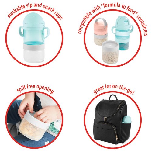 Táto praktická 5dielna súprava na jedlo a pitie pre bábätká a batoľatá má špecifický dizajn pre stohovanie, čím sa prispôsobí vašim meniacim sa potrebám. Vďaka tejto sade môžu vaše detičky popíjať a maškrtiť doma aj na cestách. Vďaka dvom kompatibilne vymeniteľným otočným uzáverom/viečkam, dvom nádobám a voliteľnej rukoväti vám táto sada umožňuje používať jednotlivé komponenty samostatne alebo ich naskladať dohromady. Naplňte ich cereáliami, sušienkami, ovocím, vodou, džúsom a ďalšími obľúbenými jedlami vášho drobčeka a môžete ísť do sveta.