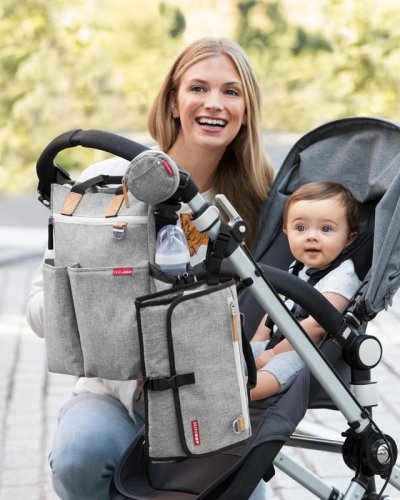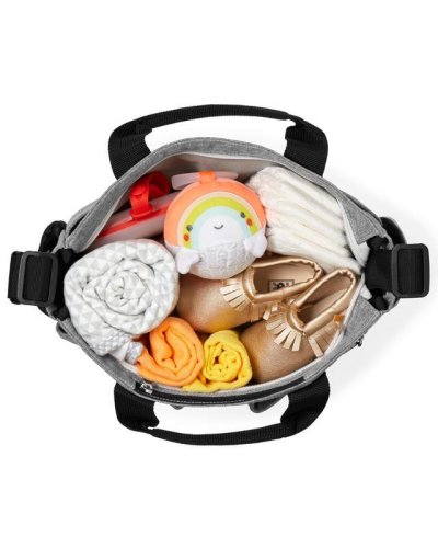 Oddelené vrecká umožňujú väčšiu prehľadnosť - celkom 10 praktických vreciek. Tašku je možné pohodlne zavesiť na kočík alebo ju nosiť voľne cez rameno či v ruke. Obsahuje patentované "Shuttle Clips", vďaka ktorým je možné ramenný popruh ľahko odopnúť alebo nechať na taške - podľa vášho vkusu. Odopnite menšiu pracku, obtočte pás okolo rukoväte kočíka a zaistite. Väčšou sponou je možné odopnúť ramenný popruh. Protišmykové popruhy na kočík. Súčasťou bočné vrecko na fľašu a vrecko na mobilný telefón. Vrecká sa zapínajú na magnety alebo zipsy. Vnútri tašky je kontrastná podšívka, vďaka ktorej všetko ľahko nájdete. Taška ďalej obsahuje polstrovanú prebaľovaciu podložku.