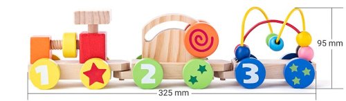 Vláčik pre najmenších ponúka deťom hneď niekoľko prvkov na precvičenie jemnej motoriky: skrutka na lokomotíve, korálky na drôtenej konštrukcii, pohyblivé koliesko. Obsahuje: 3 dieliky. Rozmer: 32,5 x 9 cm. Rozmer balenia: 35 x 7,5 x 9 cm. Vek: 18m+