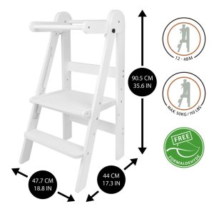 Táto vzdelávacia veža LOFTY je vyrobená z vysoko kvalitnej preglejky a je určená pre deti vo veku 18–48 mesiacov. Maximálna nosnosť až 50 kg. Rozmery výrobku: 47,7 (Š) x 44 (H) x 90,5 (V) cm. NASTAVENIE VÝŠKY: Výška plošiny je možná v 3 polohách, aby vyhovovala výške dieťaťa: 29,4, 36,9, 44,4 cm (merané od podlahy). JEDNODUCHÉ: Dieťa môže na vzdelávaciu vežu vyliezť samostatne, schodík vo výške 16 cm od podlahy, čo dieťaťu pomáha bezpečne nastúpiť na výrobok. VŠESTRANNÉ: Výška veže je navrhnutá tak, aby sa zmestila na väčšinu kuchynských dosiek alebo do kúpeľne. umývadlá. SKLADACIA: Táto veža je skladacia, ľahko sa prenáša z kuchyne do kúpeľne a šetrí miesto pri skladovaní. BEZPEČNÉ: Drevený materiál bol testovaný a potvrdené, že neobsahuje formaldehyd.
