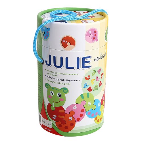 Pomocou jednoduchej skladačky v tvare dážďovky sa deti môžu zábavným spôsobom naučiť chápať postupnosť a základné čísla. Robustné dieliky sú ľahko uchopiteľné a pestro sfarbené, ľahko si tak získajú a udržia detskú pozornosť. Vyrobené z masívneho dreva ošetreného nezávadnými farbami. Dodávané v praktickej, ľahko prenosnej tube opatrenej pútkom. Hlavné vlastnosti: 10 dielov skladačkyodolné prevedenie z masívneho drevapraktické balenie