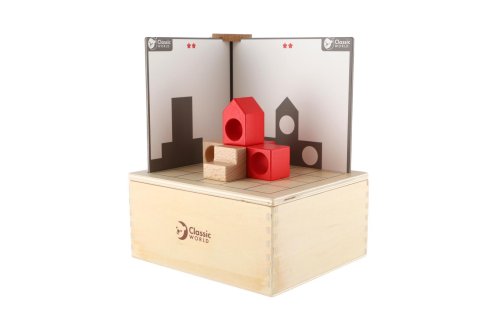 Táto sada blokov precvičí priestorovú orientáciu detí a schopnosť logického myslenia. Súprava využíva inšpiráciu zo svetelnej projekcie. Deti pomocou svojho priestorového myslenia zostavia blok podľa kartičky a musia sladiť obe strany. Karty sú od jednoduchých až po ťažké úrovne. Balenie obsahuje 41 drevených dielikov a 14 kariet. Rozmer drevenej krabičky: 18,5 x 16 x 9 cm Vhodné pre deti od 3 rokov