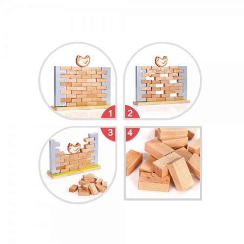 Skvelá drevená hra pre celú rodinu, ktorej hlavnou prednosťou sú jednoduché pravidlá, logické myslenie a zábava pre všetky vekové kategórie. Postavte stenu zo špeciálne pripravených blokov. Umiestnite sliepku na vrchol a potom tehly jednu po druhej vytiahnite zo steny. Keď sa múr zrúti, hra končí. Pri hre sa vaše batoľa naučí sústredenie, stratégiu a riešenie problémov a zlepší si koordináciu rúk a očí. Rozmer balenia: 26 x 24,5 x 4 cm Vhodné pre deti od 3 rokov