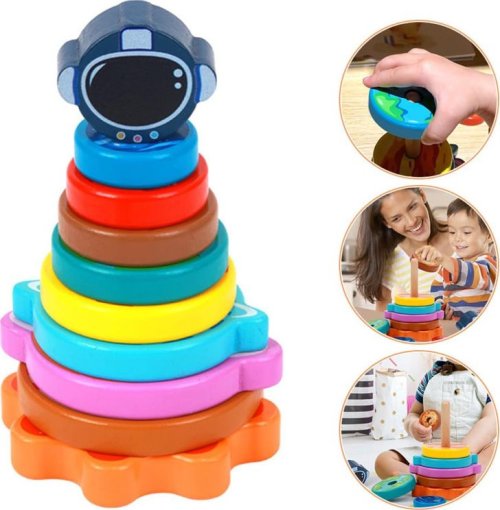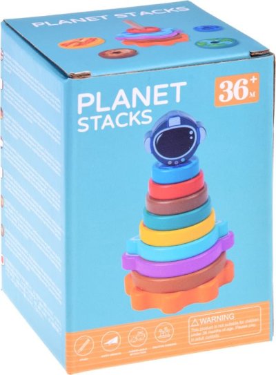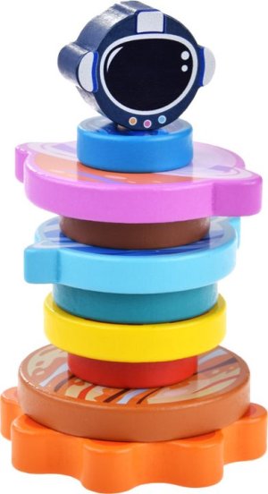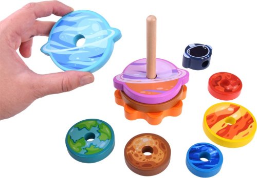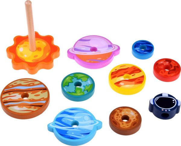 Skladačka má vesmírny dizajn - disky predstavujú planéty a základňa slnka. Každý diel je opatrený otvorom tak, aby ho dieťa mohlo jednoducho nasadiť na stojan a napájať jeden diel na druhý. Hra podporuje prirodzený vývoj dieťaťa, koncentráciu, koordináciu oko-ruka, logické uvažovanie, jemnú motoriku, predstavivosť a učia dieťa nachádzať rozdiely. Príjemné spracovanie - žiarivé farby vzbudzujú u dieťaťa záujem o hračku.