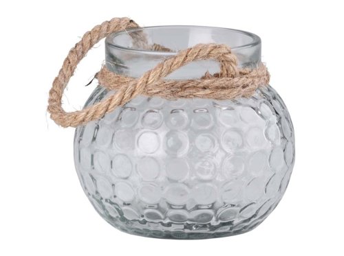 Dekoratívna lampa z číreho skla (115 × 95 mm) so závesom z prírodného lana je vhodná na zavesenie doma aj vonku. Vďaka menšej veľkosti sa hodí do menších priestorov, kde vytvorí útulnú atmosféru. Vhodná pre čajovú sviečku alebo drobné LED svetlo. Skvelá voľba pre romantické večery, sezónnu výzdobu aj slávnostné príležitosti.