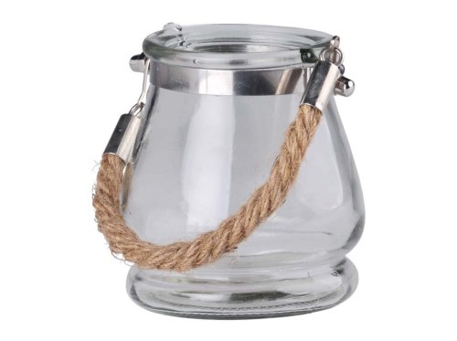 Kompaktná lampa z číreho skla o veľkosti 95 × 90 mm so závesom z prírodného lana je ideálna na zavesenie na menší priestor. Hodí sa pre čajové sviečky, ktoré v nej vytvárajú jemné a útulné osvetlenie. Skvelá ako drobný doplnok do interiéru, na slávnosti alebo letné večery.