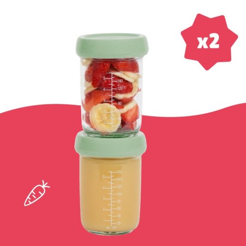 Sada 2 sklenených misiek na uchovávanie detskej stravy.
