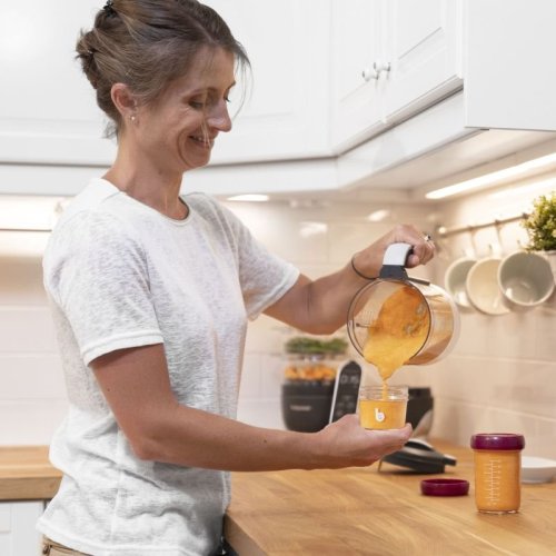 Babymoov skladovacie misky majú objem 100ml a 220ml . Majú viečko so skrutkovacím uzáverom a hermetickým, silikónovým tesnením. Na stene misiek je stupnica (v ml av oz) a na vrchnej strane viečok je prepisovateľný povrch , kde si môžete jednoducho poznamenať uvarený pokrm a dátum, kedy bol pripravený.