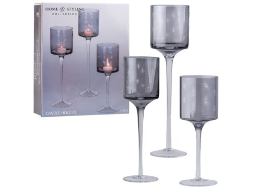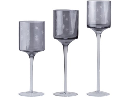 Súprava troch sklenených svietnikov s rozmermi 90 × 250, 90 × 300 a 90 × 350 mm na nožičkách. Dymové sklo dodáva moderný a sofistikovaný vzhľad. Svietniky sú vhodné pre kónické sviečky alebo čajové sviečky a vytvárajú príjemnú a hrejivú atmosféru v interiéri.