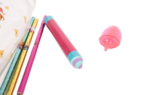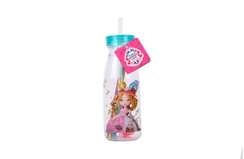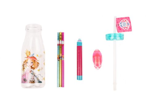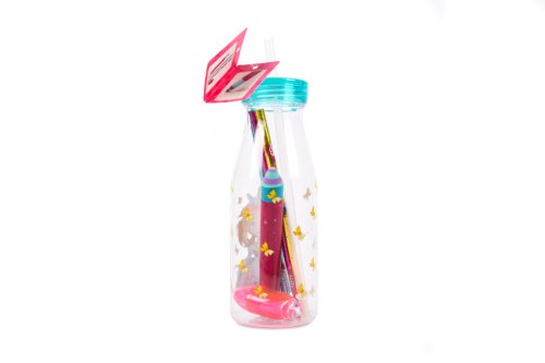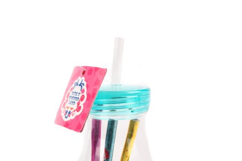 Školská sada v fľaštičke s slamkou. Obsahuje strúhadlo, tri ceruzky a gumu. Vyrobené z nezávadného plastu - fľaštičku so slamkou možno po vymytí použiť na pitie.
