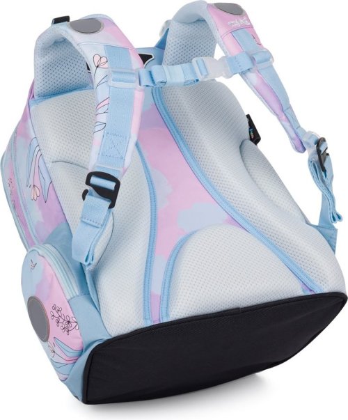 Školský batoh OXY GO zaujme moderným dizajnom a premyslenou funkčnosťou. Má anatomicky tvarovaný, priedušný chrbát a nastaviteľné ramenné popruhy pre pohodlné nosenie. Pridané háčiky umožňujú uchytenie dlhých popruhov. Vnútorné vrecká ponúkajú dostatok miesta na učebnice, zošity aj ďalšie potreby, pevné nepremokavé dno chráni obsah pred ušpinením a pretečením. Bočné vrecká, jedno na zips a jedno otvorené, slúži napr. na fľašu. Reflexné prvky zaisťujú bezpečnosť. Batoh je ideálny pre deti od 1. do 3. triedy vysokej od 125 cm. Dĺžka chrbtového panelu je 39 cm, objem 22 l, hmotnosť 930 g, nosnosť 8 kg. Vrecko: Praktické na cvičky alebo voľnočasové aktivity, uzatvára sa šnúrkami. Peračník: Jednoposchodový s dvoma chlopňami, pútka na písacie potreby a priehľadná fólia na rozvrh hodín.