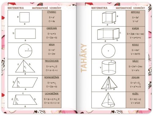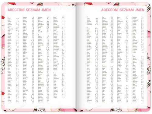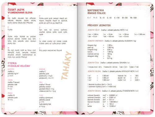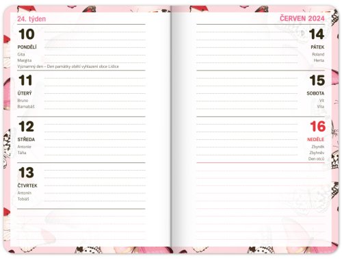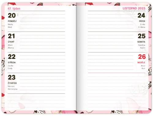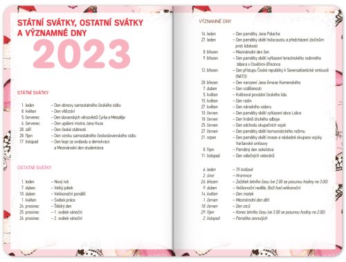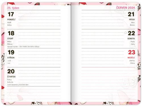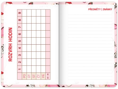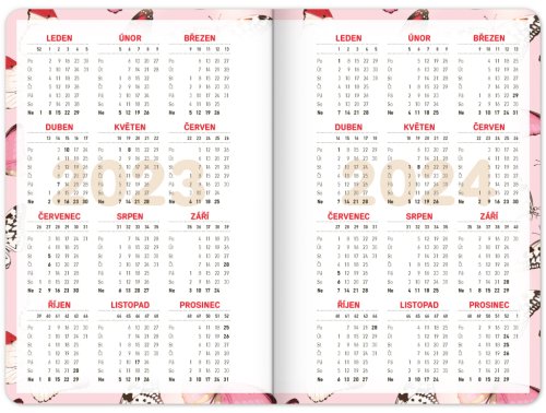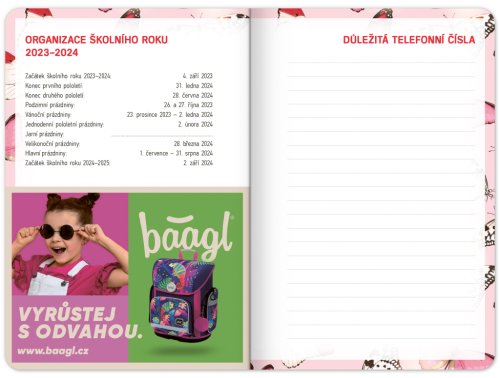 Školský diár s abstraktným motívom v ružovej farbe obsahuje prehľad na rok 2023 a 2024, české týždenné riadkové kalendárium s menami a sviatkami, rozvrh hodín, priestor na poznámky. Kalendárium začína v septembri 2023 a končí v decembri 2024.