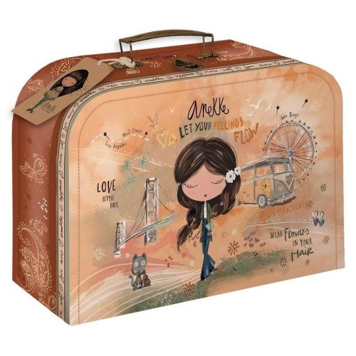 Papierový detský kufrík veľkosti 35cm s motívom známeho dievčatka Anekke z dielne španielskej dizajnérky. <br> • je vyrobený z kvalitného pevného kartónu s vnútornou potlačou a kovovým uzatváraním s rukoväťou <br> • je vhodný na školské potreby, výtvarné potreby, do ktorého zmestí aj blok farebných papierov A4 <br> • jeho využitie v detskom svete je veľké, možnosť uloženia hračiek ale aj iných drobností na cestu k babičke