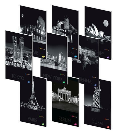 Pôsobivé čiernobiele fotografie svetových metropol tvoria kolekciu obalov kvalitných zošitov nielen pre študentov. Matnú pevnú obálku dopĺňajú leskom zvýraznené detaily. Formát A4, 40 listov (papier 80 g), linajkový. Celkom 9 rôznych motívov.