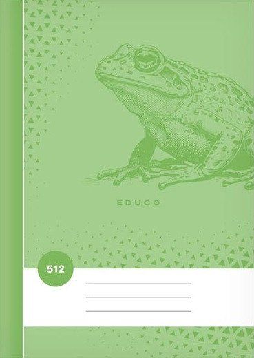 Školský linajkový zošit vo formáte A5, v zelenej farbe, s motívom žaby, v doskách z kriedového papiera. Zošit je určený predovšetkým pre prváčikov, ktorí sa začínajú učiť písať. Stránky sú bez okrajov. <br><br> Typ: 512 <br> Formát: A5 <br> Motív: žaba <br> Farba: zelená <br> Šírka riadku: 16 mm <br> Gramáž papiera: 60 g <br> Počet listov: 10, linajkované <br> Dosky: matný kriedový papier 200 g