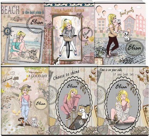 Kolekcia poznámkových zošitov s kresbami dievčaťa Elisy. Kvalitné zošity v šitej väzbe s pevnou lesklou obálkou. Formát A5, 40 listov (papier 80 g), linajkový Celkom 6 motívov.