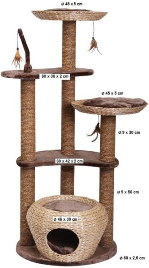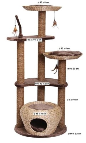 Škrabadlo z vodného hyacintu je svojou elegantnou formou ozdobou každej miestnosti. Veľmi moderné a kvalitné nemecké škrabadlo pre mačku. Pohodlné odpočívadlo na škrabanie s pelechom a polstrovanou vyhliadkou. Mačky musia mať možnosť na brúsenie svojich pazúrikov. Vo voľnej prírode im na to najlepšie slúžia stromy a ich kôra. V byte im potom musíte Vy ponúknuť tú pravú a vhodnú alternatívu. Inak si malý nezbedník nájde náhradu napríklad vo Vašom nábytku, kresle alebo koberci. Rozmery: