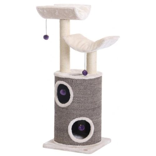 Pohodlný strom na škrabanie s pelechom a polstrovanou vyhliadkou. Mačky musia mať možnosť na brúsenie svojich pazúrikov. Vo voľnej prírode im na to najlepšie slúžia stromy a ich kôra. V byte im potom musíte vy ponúknuť tú pravú a vhodnú alternatívu. Inak si malý nezbedník nájde náhradu napríklad vo vašom nábytku, kresle alebo koberci. Plošiny na ležanie sú kompletne potiahnuté plyšom, horná vyhliadka je polstrovaná, škrabadlo je vyvedené v elegantnej béžovej farbe a obsahuje plyšové fialové guličky s rolničkami na hranie. Parametre: