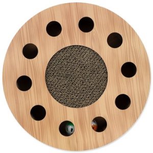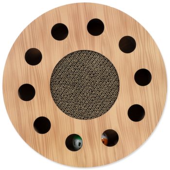 Interaktívne kartónové škrabadlo pre mačky so šantou, farebné prevedenie vo vzore dub.